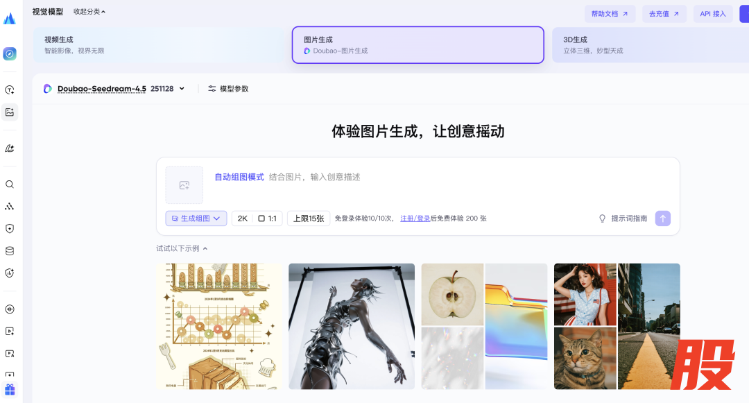 在火山引擎AI体验中心即可试用最新模型,注册登录后可免费生成200张。
