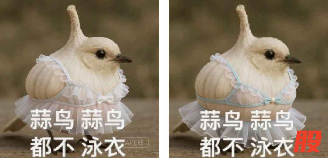 我们先拿它来修几张图:先上传一张模糊的蒜鸟表情包,让它参照生成一个新的蒜鸟,要穿蓬蓬公主裙泳衣的那种:
