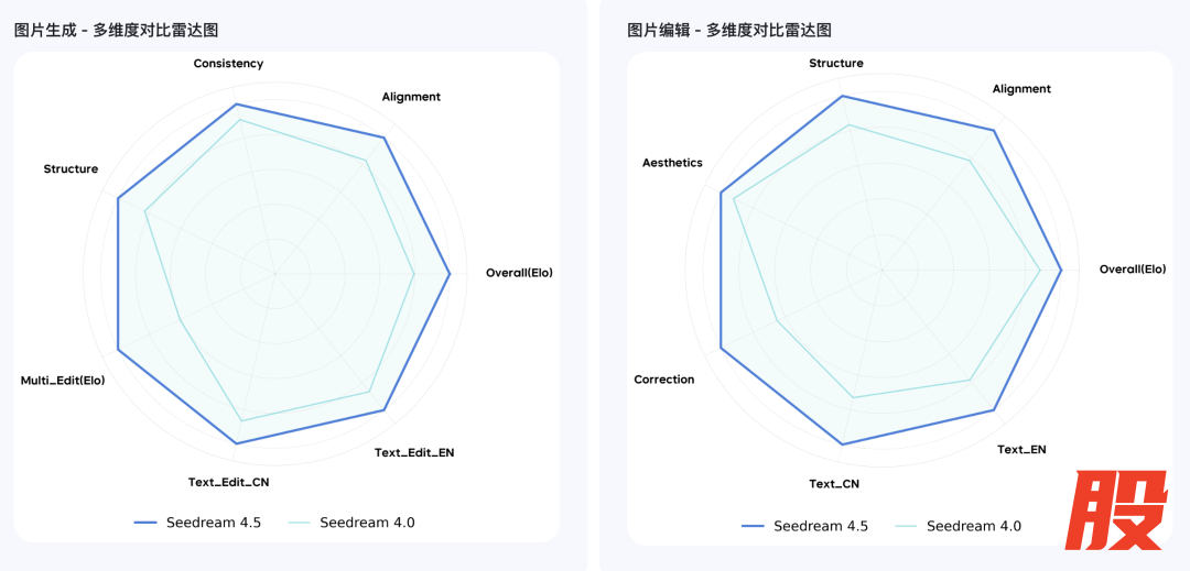 在内部多维度基准测试MagicBench上,Seedream 4.5与上一代Seedream 4.0相比,在指令遵循、一致性、美学表现等多个维度表现全面提升。