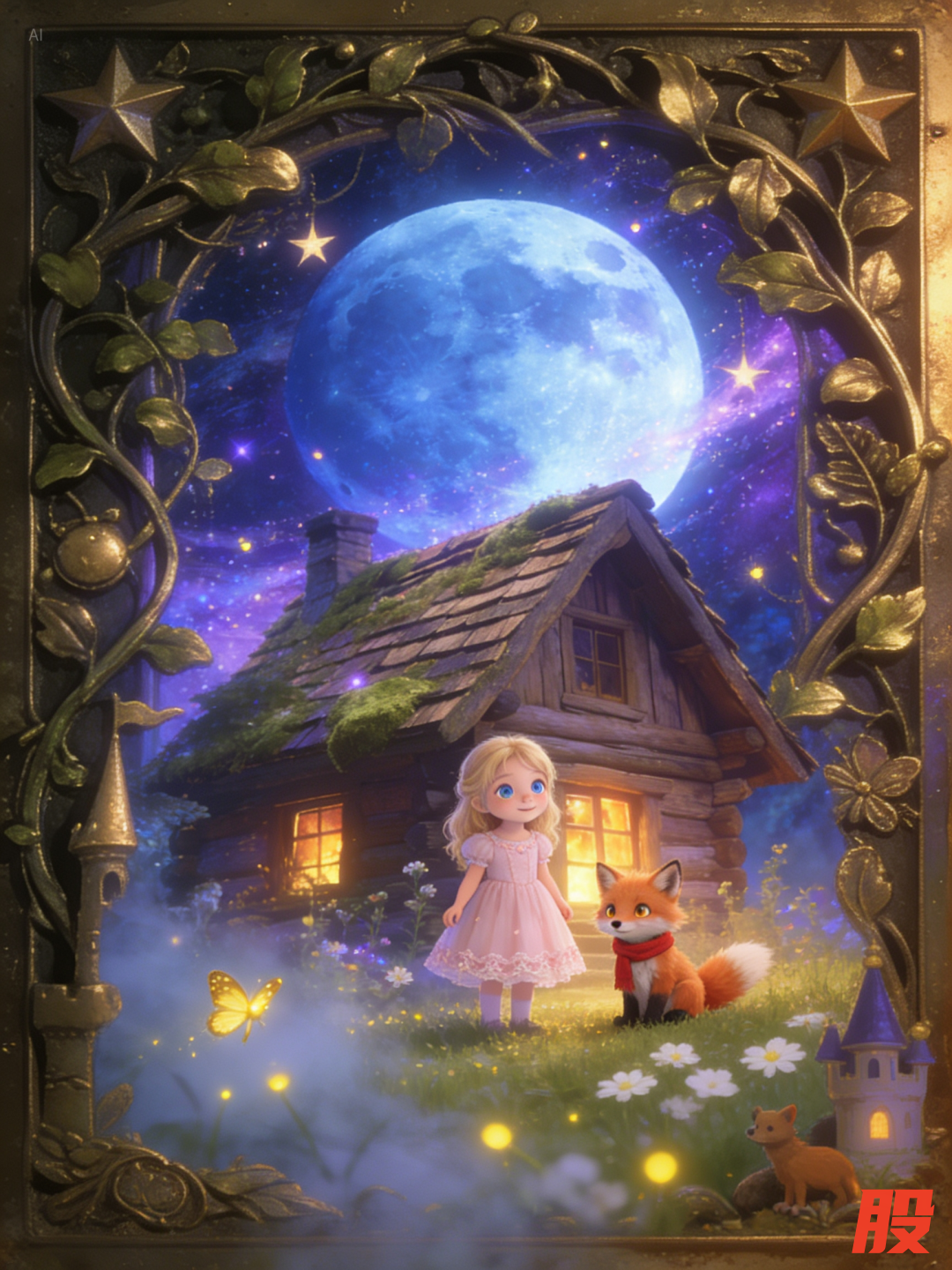 童话故事书封面:小女孩与小狐狸站在发光森林小屋前,月亮巨大而梦幻,星尘在他们周围飘浮;萤火虫的光点点亮草地;小白花细致点缀;雾气营造柔和深度;古铜色童话边框华丽包围整个场景;色调是蓝紫与暖金对撞;角色面部特征保持原图一致;整体梦幻、温柔、魔法感强烈,适合作为儿童绘本封面。