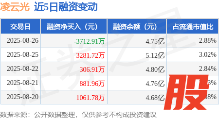 本站消息,8月26日,凌云光(688400)融资买入8241.28万元,融资偿还1.2亿元,融资净卖出3712.91万元,融资余额4.75亿元,近20个交易日中有12个交易日出现融资净买入。